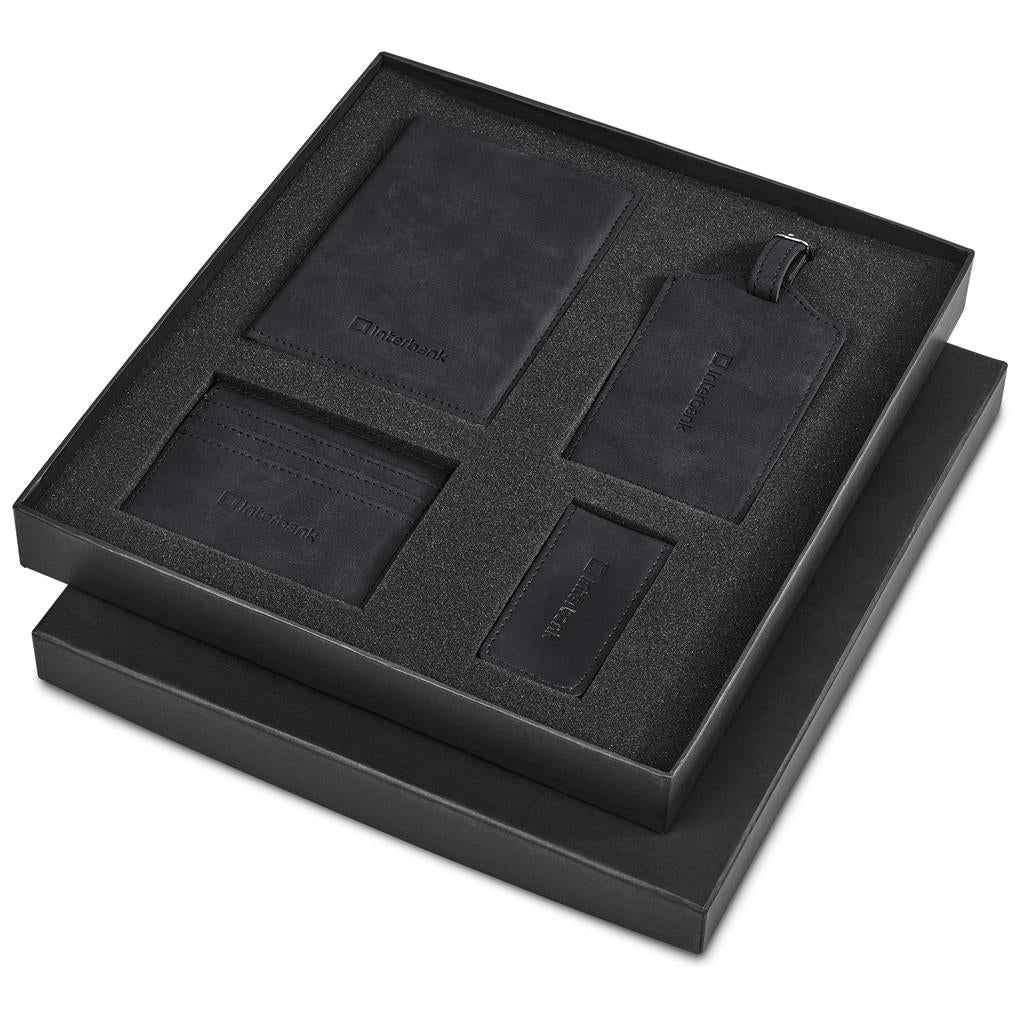 The Serendipio Tourist Travel Set features essential travel accessories: a passport holder, luggage tag, card holder, and money clip, all crafted from durable brushed PU. Each item is designed for uniform debossing to streamline branding. The set is elegantly packaged in a black gift box, measuring 28.7 x 26.5 x 3.5 cm, ensuring a refined presentation for travelers.